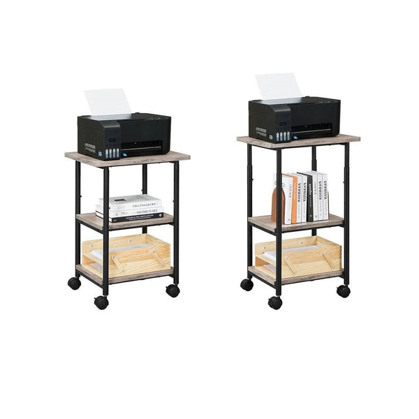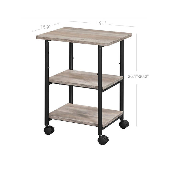 Is your printer taking up too much space on your desk? Or, does it feel like your printer is miles away? Try out this Modern Industrial Black Metal Grey Wood Printer Stand Shelf Cart! It offers your an extra-spacious table top to keep your printer within easy reach. With the adjustable table top, you get a flexible space with a lower height at 26.6” or a higher height at 30.1”. All you need to do is set it at your favorite height and invite printers, paper reams, and other office supplies in. Colleagues may come and go, but this printer stand will be always by your side as your committed partner. It’s made of high-quality particleboard and a sturdy steel frame, which is stable and durable. The most convenient part about this printer stand is that it’s equipped with 4 rolling casters, 2 of which are lockable. You can move it around no matter where you need it and lock it in position. In addition to a printer stand, what else did you see from its original mix of greige particleboard and industrial black steel? A simple, rustic storage cart! You can roll it in through your home as a kitchen trolley or a side table.
